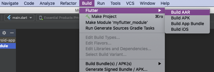 Android Studio supports add-to-app flows on Android Studio 2022.2 or later with the Flutter plugin for IntelliJ. To build your app, the Android Studio plugin configures your Android project to add your Flutter module as a dependency.